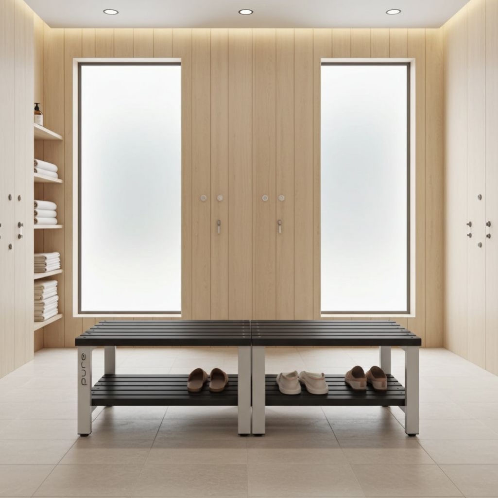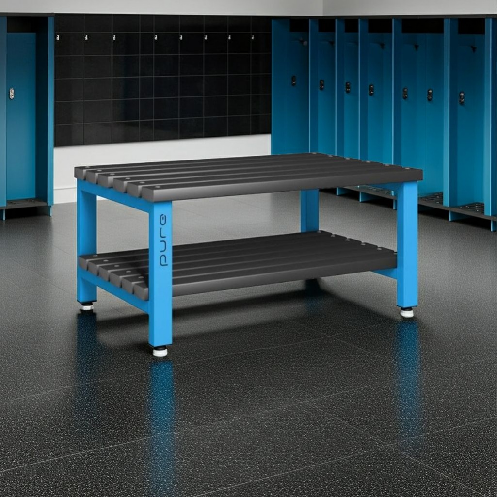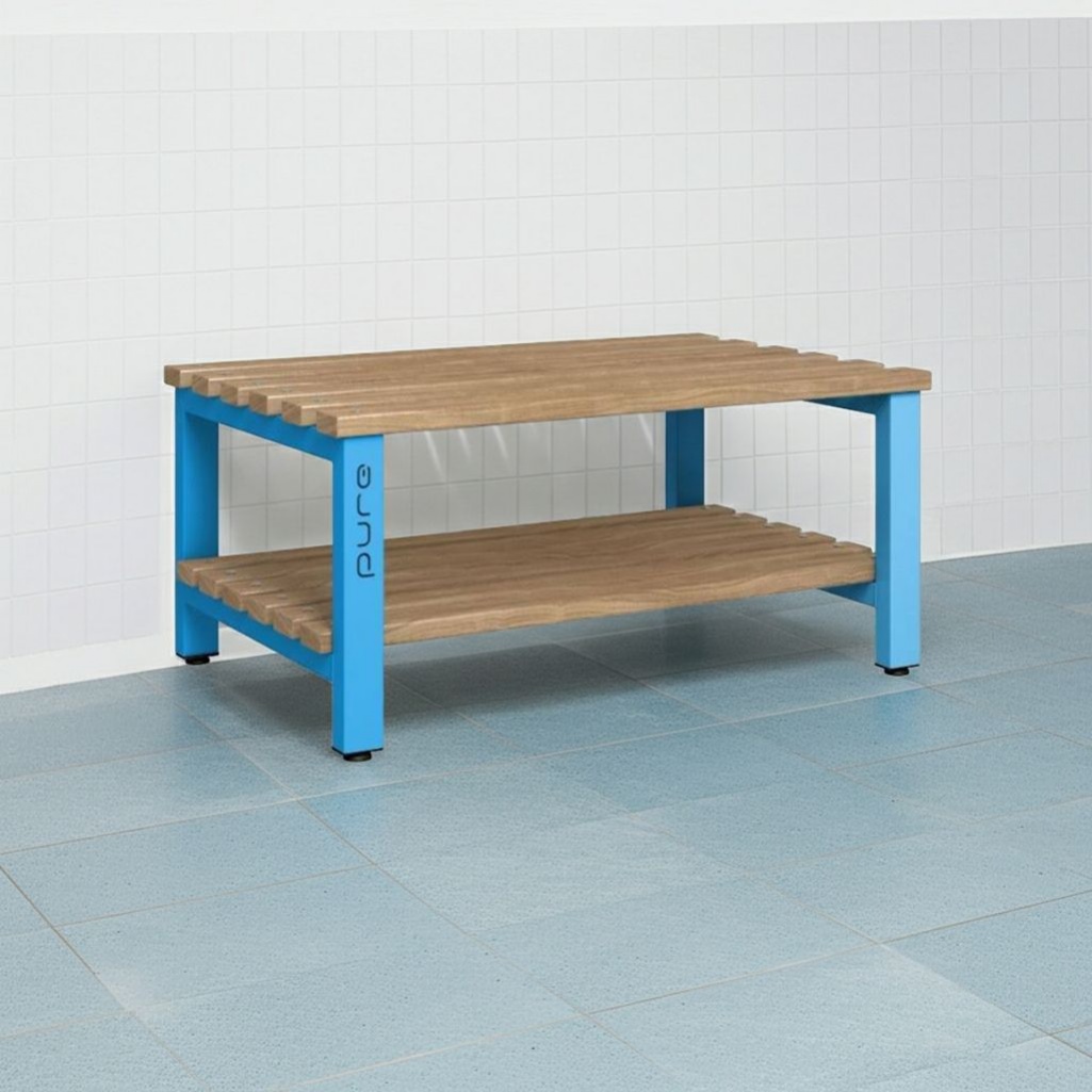 Spacious, hygienic, and storage-ready - this antibacterial double-sided changing room bench with a base shelf is ideal for schools, gyms, healthcare, and workplace locker rooms.